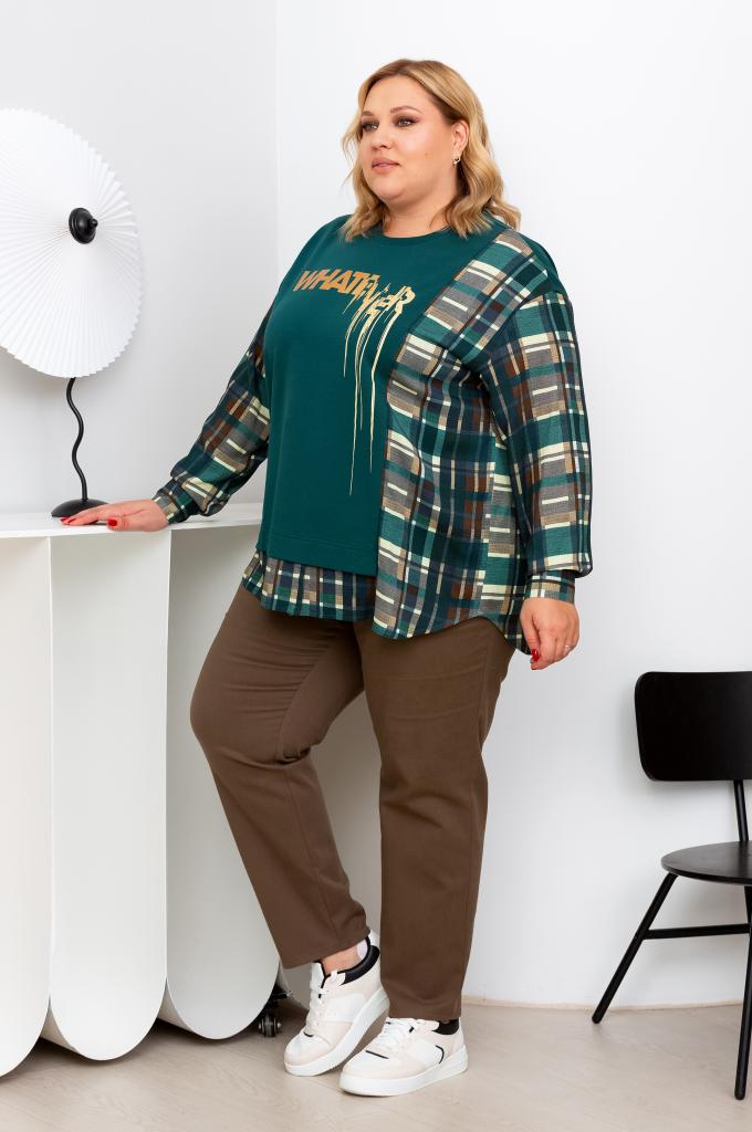 Современная фуфайка прямого силуэта, длиной до бедер,из трикотажного полотна изумрудного цвета и отделочной ткани в зелено-бежевую клетку. Модель с закругленной горловиной, обработанной косой бейкой и с длинным рубашечным рукавом на манжете с пуговицей. Центральная часть переда из зеленого трикотажа украшена принтом «шрифт» золотистого цвета. Боковая часть полочки, рукава и спинка выполнены из ткани в клетку. На спинке имеется кокетка из зеленого трикотажа, декорированная двойной отделочной строчкой. По центру спинки расположен маленький лейбл «круг». Низ изделия имеет округлую конфигурацию, как у рубашки. Фуфайка удобна и комфортна в носке, а стильный дизайн позволяет подчеркнуть Вашу индивидуальность.