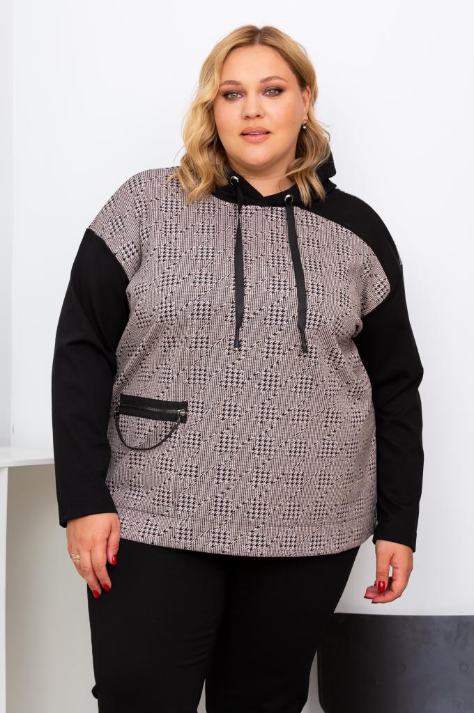 Современный джемпер прямого силуэта, длиной чуть выше бедер,из трикотажного полотна черного цвета и отделочной ткани бежевого цвета с рисунком. Модель с втачным рукавом,со спущенной линией плеча. Полочка выполнена из отделочной бежевой ткани. Слева на полочке в области плеча имеется глубокая складка, направленная вверх и закрепленная двойной отделочной строчкой. Справа в области ниже талии расположена настрочная тесьма-молния черного цвета с металлическими зубьями, имитирующая широкую листочку с декором- подвесной змейкой. Модель с капюшоном, украшенным круглыми серебристыми люверсами с черной тесьмой. Спинка, рукава и капюшон выполнены из черного мягкого трикотажного полотна. Оригинальная по своему дизайну модель позволяет выглядеть стильно и молодежно в сезоне осень-зима 2022